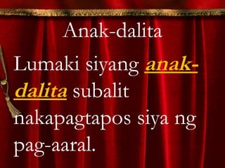 Maari din itong sabihing naghihirap na anak o hindi madaling maabot ang mga pangangailangan sa buhay kahit pa nagsisikap pa ng maige. Contextual translation of anong ibig sabihin ng dalita into English.